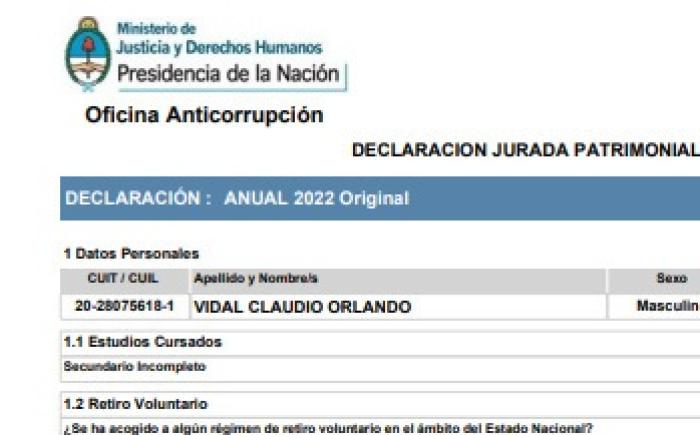 Política Claudio Vidal: Secundario Incompleto La declaración Jurada Patrimonial fue presentada a la oficina anticorrupción cuando era Diputado Nacional. 26/02/2024