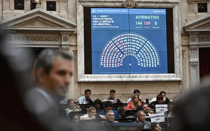 Política Celebraciones y rechazos tras la aprobación en general de la ley "Bases" El presidente Javier Milei, referentes del oficialismo y sus aliados resaltaron la aprobación en la Cámara, mientras políticos opositores piden "justicia social" 03/02/2024