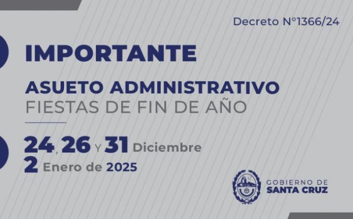 El Gobernador Claudio Vidal, firmó el Decreto N°1366/24 a través del cual el Gobierno de Santa Cruz, dispone asueto administrativo para los días 24, 26 y 31 de diciembre de 2024 y 2 de enero de 2025, para el personal de la Administración Pública Provincial.