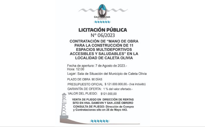 Locales Licitación Pública 06/2023 Para contratación de mano de obra para la construcción de 11 espacios deportivos saludables y accesibles 29/07/2023