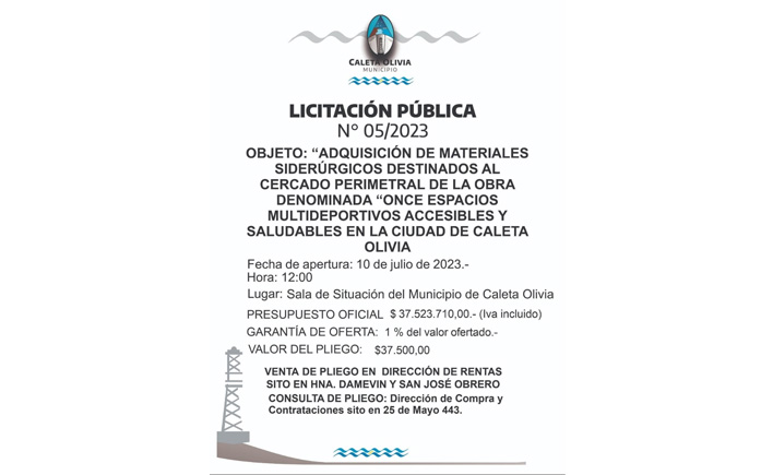 Locales La Municipalidad de Caleta Olivia llama a Licitación Pública El objeto de la misma es la adquisición de materiales siderúrgicos destinados al cercado perimetral de espacios polideportivos 03/07/2023